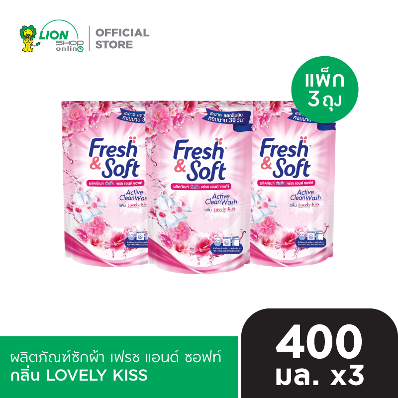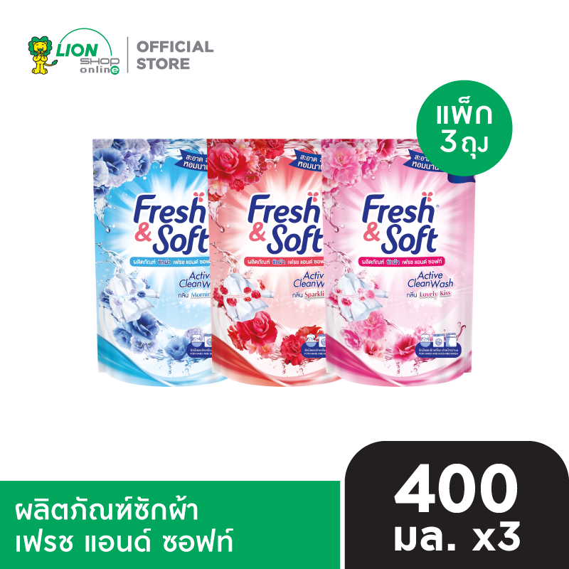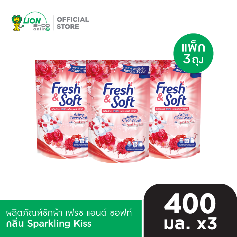 [แพ็ก3] FRESH & SOFT น้ำยาซักผ้า เฟรช แอนด์ ซอฟท์ ชนิดเติม 400 มล. 3 ชิ้น 3 ตัวเลือก Morning Kiss (สีฟ้า) Lovely Kiss (สีชมพู) Sparkling Kiss (สีแดง)