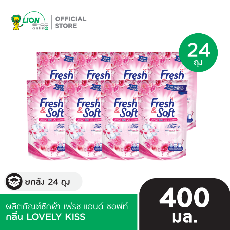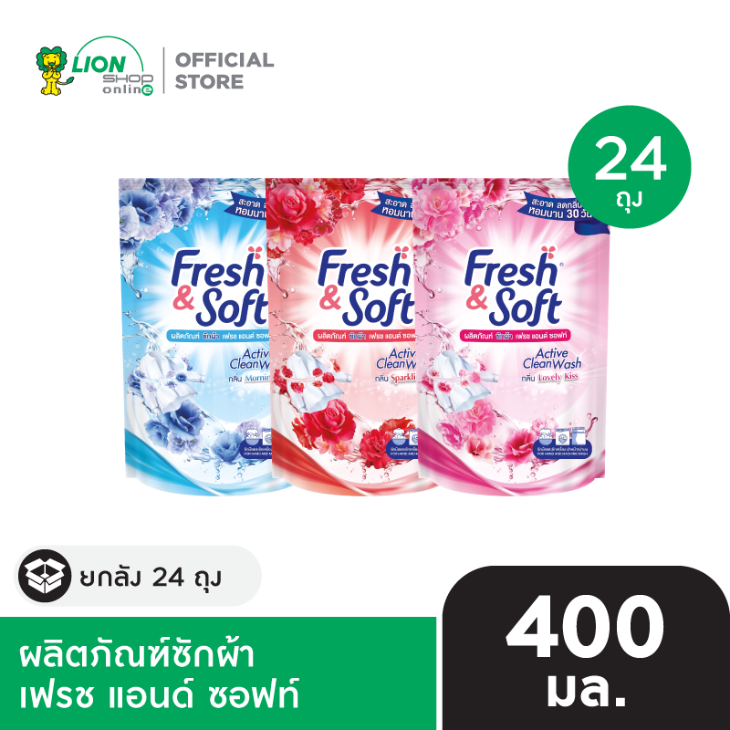 [ยกลัง] FRESH & SOFT น้ำยาซักผ้า เฟรช แอนด์ ซอฟท์ ชนิดเติม 400 มล. 24 ชิ้น มีให้เลือก 3 กลิ่น SPARKLING KISS (สีแดง) LOVELY KISS (สีชมพู) MORNING KISS (สีฟ้า)