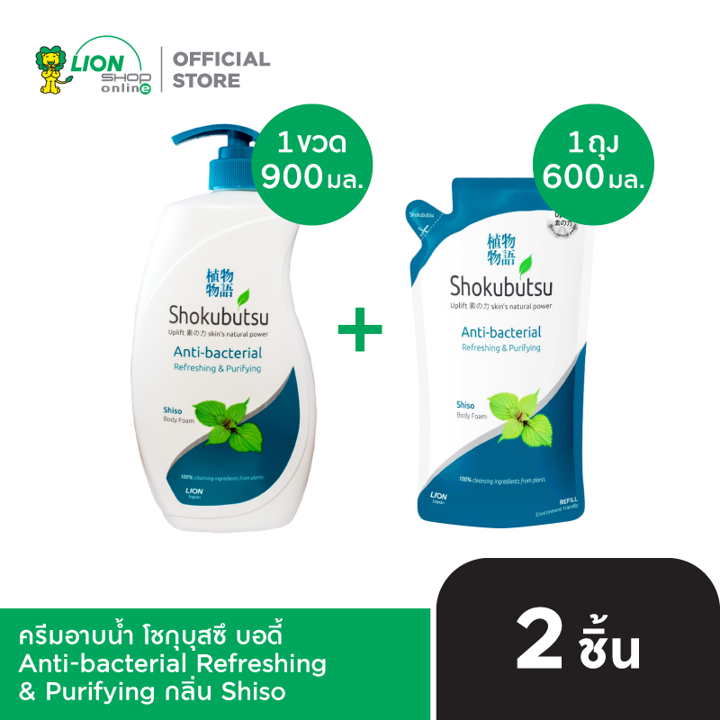 SHOKUBUTSU ครีมอาบน้ำ โชกุบุสซึ บอดี้ โฟม รีเฟรชชิ่ง & เพียวริฟายอิ้ง ขวดปั๊ม 900 มล. + ถุงเติม 600 มล. LIONSOS