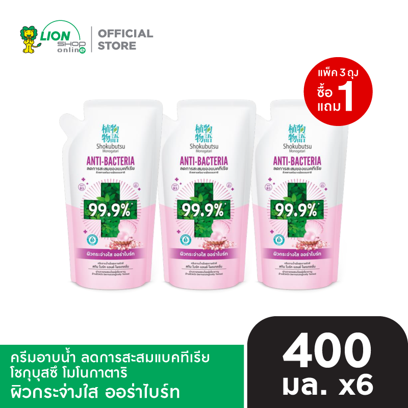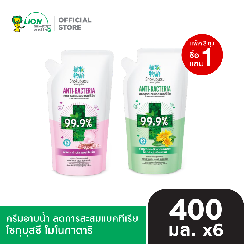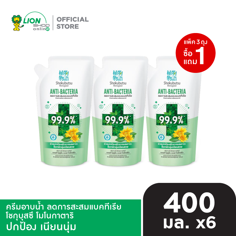 [1 ฟรี 1] [แพ็ก 3] SHOKUBUTSU ครีมอาบน้ำลดการสะสมแบคทีเรีย โชกุบุสซึ โมโนกาตาริ ถุงเติม 400 มล. 6 ถุง [เลือกสูตรด้านใน]