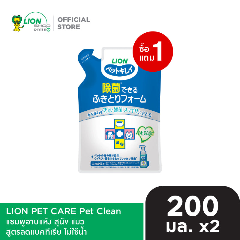 [1 ฟรี 1] Pet Clean แชมพูอาบแห้ง สุนัข แมว สูตรลดแบคทีเรีย ไม่ใช้น้ำ ขนาด 200 มล. ชนิดถุงเติม (LION Pet Care)